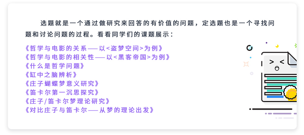 本课题属于哲学类方向,文理生均可选修,适合所有对哲学、文学感兴趣的同学,对知识储备没有特殊要求,主要通过本课程的学习,能了解一定的哲学理论、掌握论证方法,相信一定会感受到哲学深刻又朴素的学科魅力。研究的过程中需要通过书籍和网络查阅资料,对互联网有一定基础的同学均能掌握。