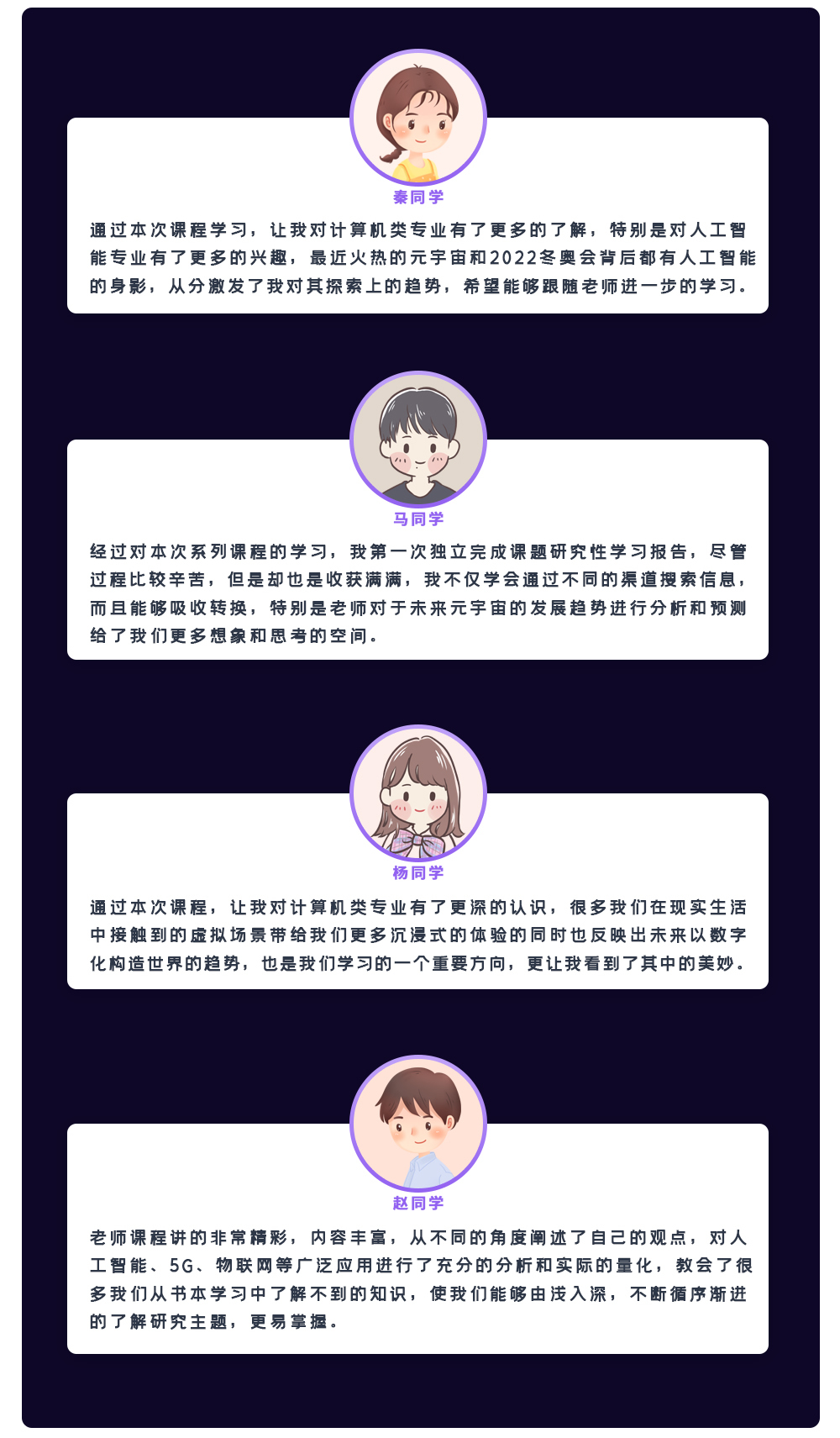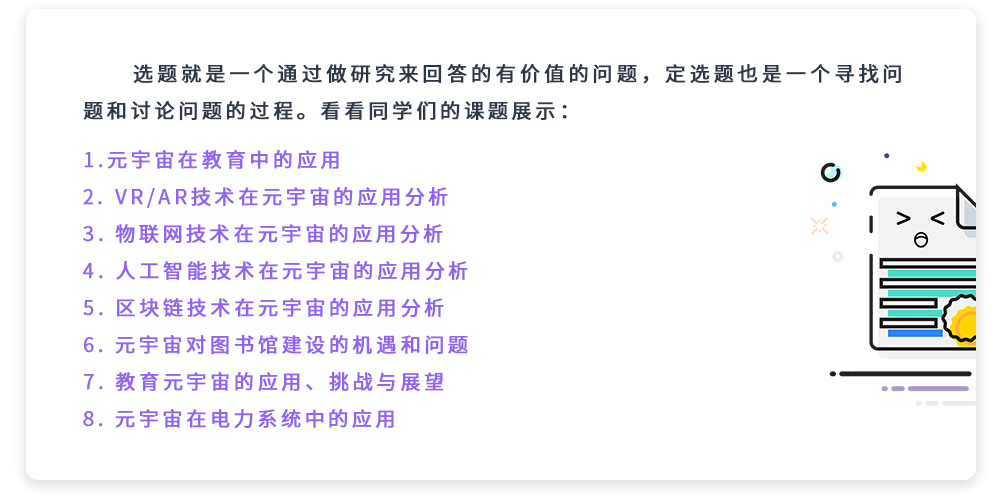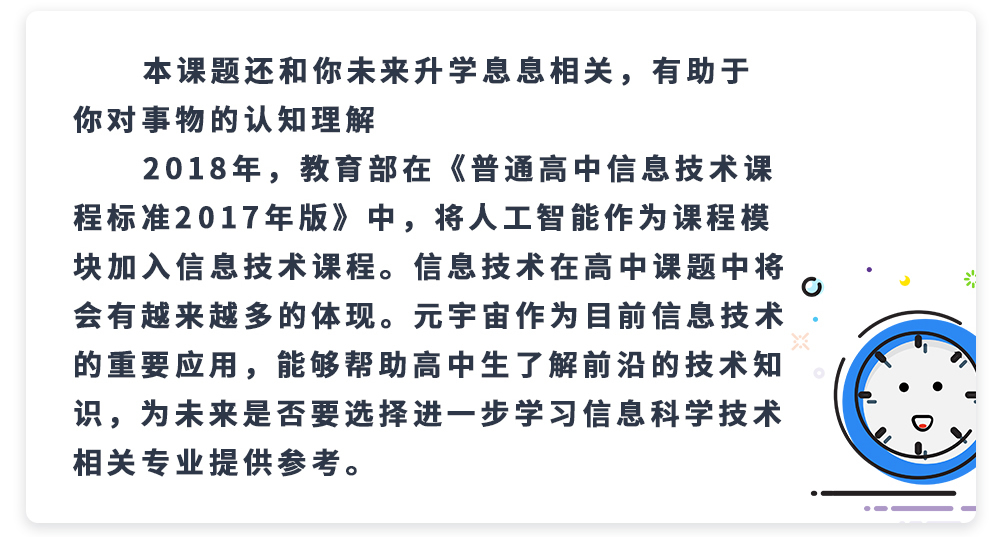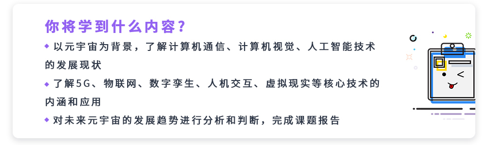本课题属于计算机类方向,文理生均适合学习,可以从技术或者经济角度出发讨论,内容与最前沿的技术相关,通过概念的介绍和技术元素的拆分入手,让你了解目前最热门的元宇宙概念。在研究过程中,带你分析元宇宙涉及的各项技术,并通过SWOT和PEST分析方法,判断这些技术能否满足元宇宙的应用需求,从而对未来元宇宙的发展趋势进行分析和预测,最终完成一份课题报告。整个课程分为六次,每次30分钟,分别讲述课题本身知识,并进行学术写作训练,为你以后进入大学学习奠定基础。